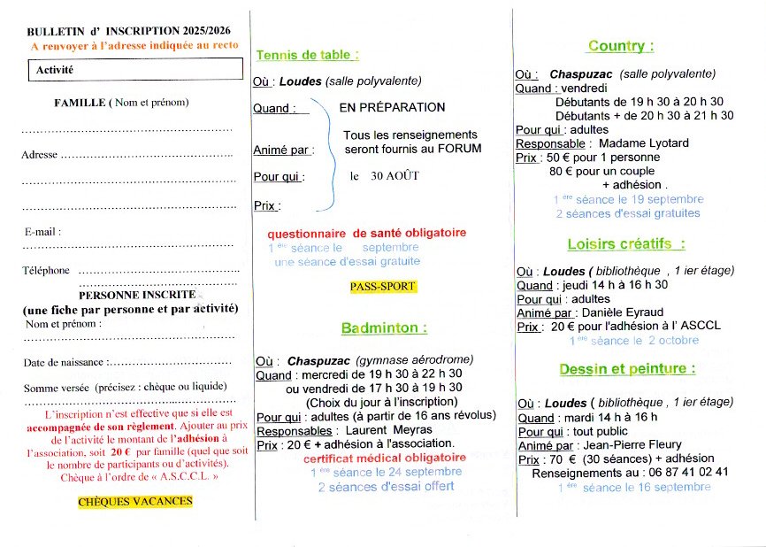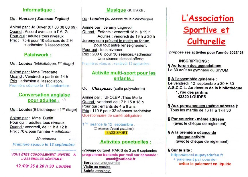 L'ASCCL propose de nombreuses activités pour adultes et enfants sur l'ex canton de Loudes (musique, informatique, patchwork, conversation anglaise pour adultes, activité multi-sport pour les enfants, badminton, country, loisirs créatifs, dessin et peinture mais aussi du tennis de table (nouveau), et encore un voyage culturel, une sortie sur la journée, une visite au musée, une soirée oenologie...)