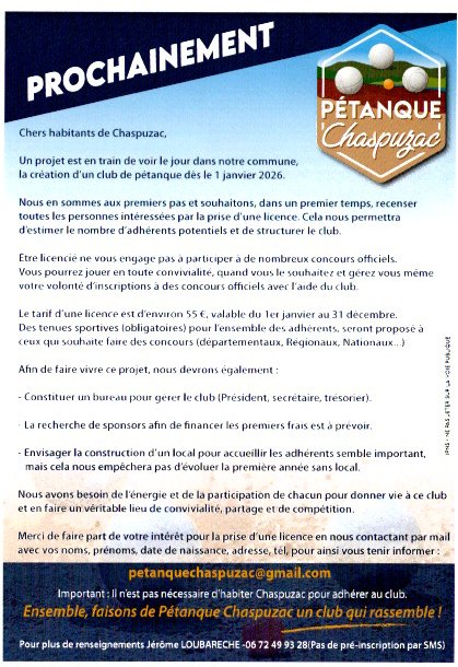 Pour plus de renseignements, télécharger le flyer : Pétanque Chaspuzac