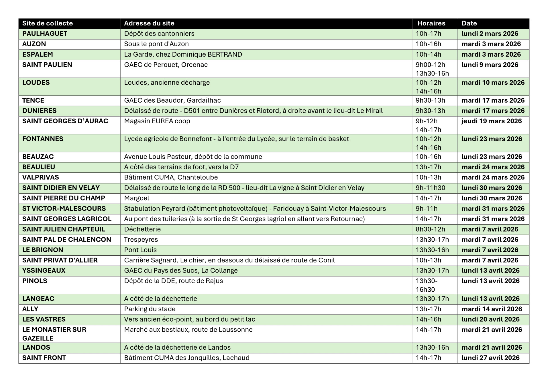 La Chambre d’Agriculture et la FDGEDA organisent l’opération campagne propre. Depuis plus de 20 ans cette opération permet aux éleveurs du secteur d’apporter les plastiques usagés (enrubannage, ensilage, ficelle et filet) sur une trentaine de sites sur l’ensemble du département de la Haute-Loire.