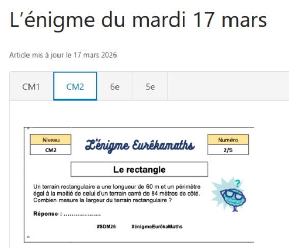 Cycle Basket Les CE2, CM1, CM2 participent à un cycle basket au gymnase de Loudes. Ce cycle est encadré par Geoffrey du club de basket de St Paulien grâce au dispositif "Basket à l'école. Les élèves de CM1 CM2 plongent dans la Semaine des mathématiquesDans le cadre de la 15e édition de la Semaine des mathématiques, organisée du 14 au 25 mars 2026 sur le thème « Égalités », les élèves de la classe de CM1-CM2 de l’école de Chaspuzac ont activement participé avec le dispositif EurêkaMaths auquel ils sont inscrits cette année. Tout au long de la semaine, ils ont relevé un défi quotidien avec la résolution d’un problème de recherche, mobilisant logique et esprit d’équipe. Le jeudi 19 mars, ils ont également pris part à une épreuve composée de 10 problèmes.
