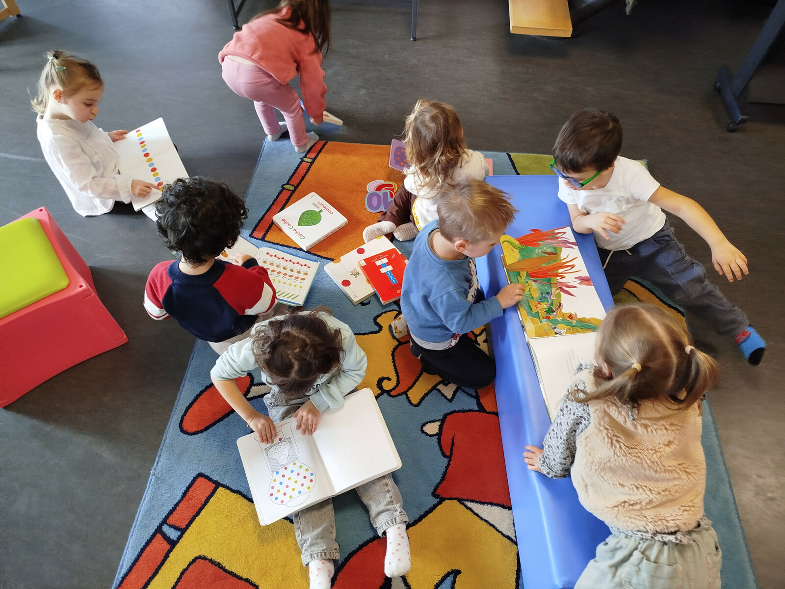 MARS/AVRIL 2026 Durant cette période, les enfants de PS et MS ont pu découvrir de nombreux albums, des documentaires, mais aussi jouer à des jeux de société et explorer des instruments de musique. MS : Découverte de quelques "pépites" de Mario Ramos, auteur illustrateur jeunesse incontournable, avec ses contes détournés : un clin d'oeil à la période précédente axée sur les contes traditionnels. Ils ont pu également découvrir le jeu de société "C'est qui le plus fort ?" , un jeu coopératif, où l'on retrouve les personnages des contes de Mario Ramos. Autres thématiques sur cette période : l'amitié, la différence et le handicap pour les MS. Des albums sur l'acceptation des différences, pour mieux comprendre que nous sommes tous uniques, différents et singuliers et que que toutes ses rencontres nous enrichissent et nous font grandir. PS : Découverte de nombreux albums et imagier à compter pour explorer la numération de façon créative et ludique. Découverte de documentaires sur les insectes, "les petites bêtes" et d'un jeu de société "Le bal masqué des coccinelles". Bal, carnaval, ballons et cotillons, le thème de la Fête s'est également immiscé dans les lectures proposées aux enfants.
